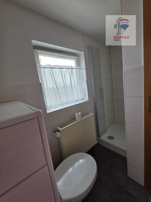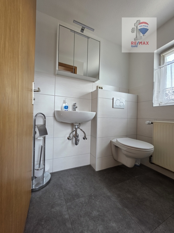 Das angrenzende Tageslichtbad ist modern gestaltet und mit Dusche, Waschbecken und WC ausgestattet.