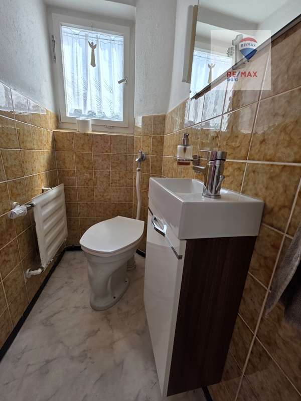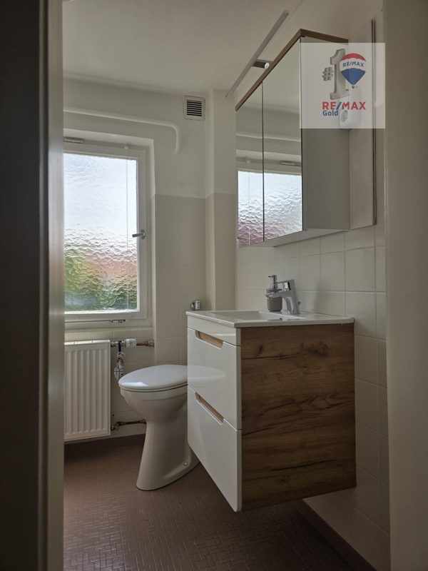 Das Tageslichtbad ist mit Badewanne, Waschbecken und WC ausgestattet.