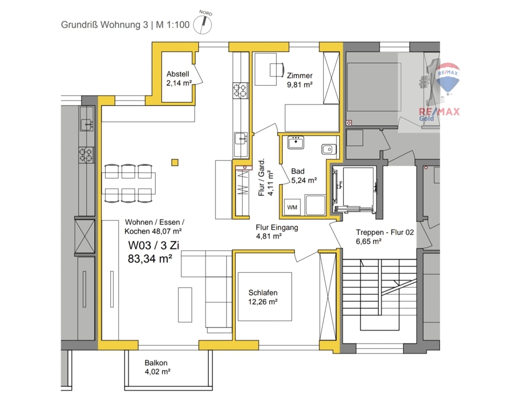 Diese komfortable und hochwertige 3-Zimmer-Wohnung mit Südbalkon befindet sich im 1. Obergeschoss des Gebäudes. Das offene Raumkonzept integriert die Küche nahtlos in den Wohnbereich und die großflächigen, bodentiefen Fenster sorgen für eine helle und luftige Atmosphäre.